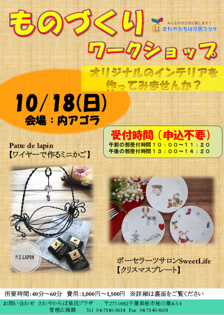 さわやかちば県民プラザでは、ものづくりの楽しさを味わいながら、オリジナルのインテリアを作ることができる「ものづくりワークショップ」を開催します。