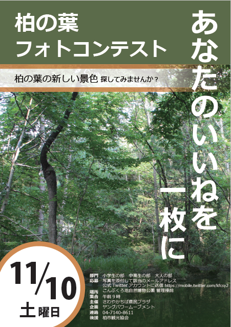 柏の葉地区のまちづくりの一環として、こんぶくろ池の魅力を県民に広めることに主眼をおいたフォトコンテストを若者が自主的に企画・運営を行っています。こんぶくろ池を始めとした柏の葉地区が持つ自然の雄大さに触れることにより、柏の葉地区のすばらしさを再確認してみませんか。